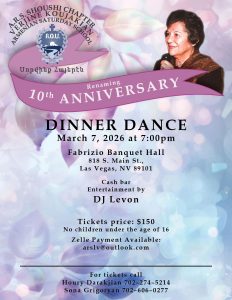 The 10th Anniversary of renaming the ARS Shoushi Chapter Verjine Koujakian Armenian Saturday School will be held on Saturday, March 7, 2026, at 7:00 p.m., Fabrizio Banquet Hall, 818 S. Main St., Las Vegas, NV 89101. Cash bar. Entertainment by DJ Levon. Tickets are $150 per person. No children under the age of 16. Zelle payments are available at [email protected]. For tickets call Houry Darakjian (702) 274-5214 or Sona Grigoryan at (702) 606-0277.