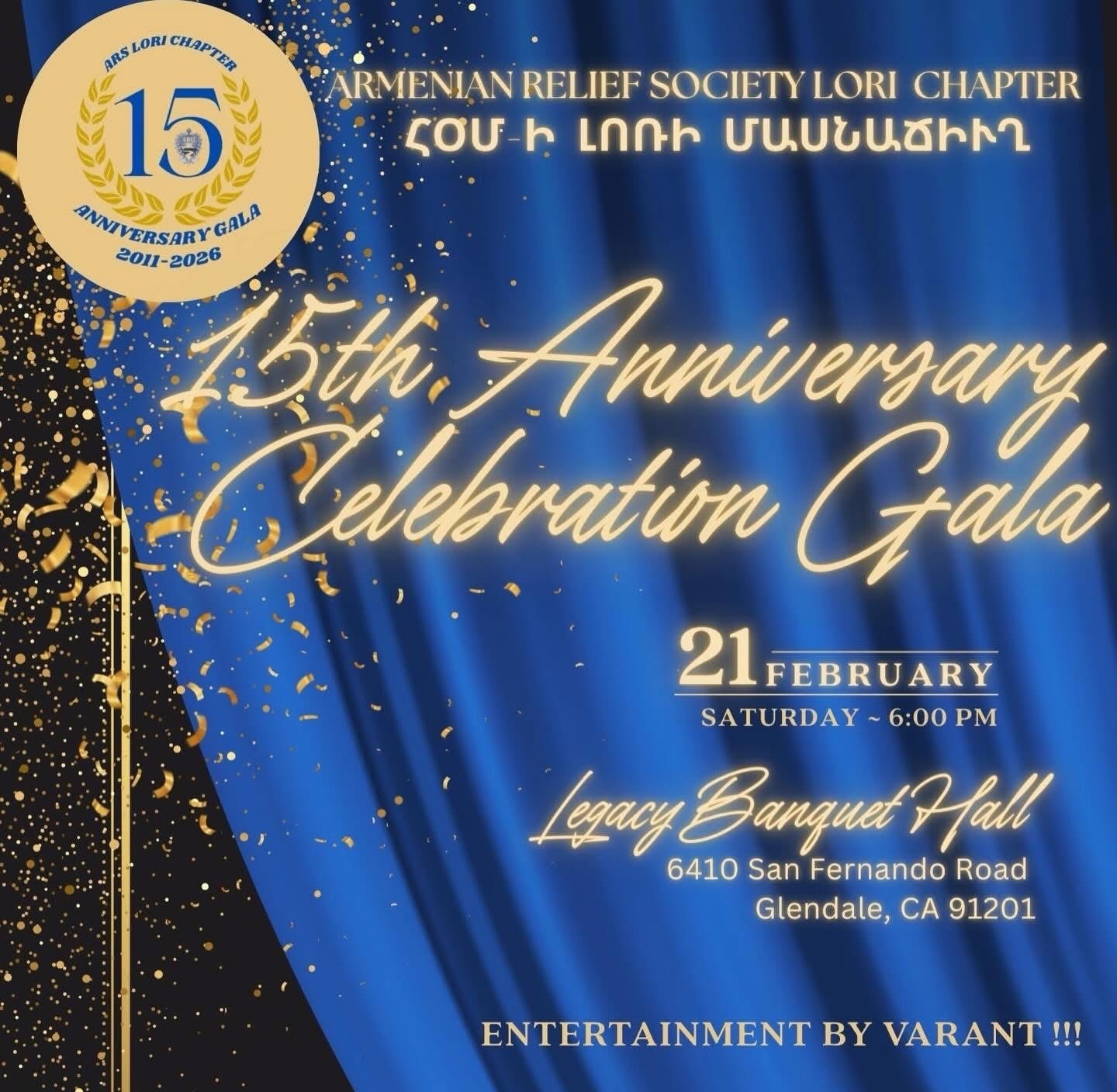 Legacy Banquet Hall 6410 San Fernando Rd., Glendale, United StatesThe ARS Lori Chapter's 15th Anniversary is scheduled for Saturday, February 21, 2026, at 6:00 pm. Tickets are $150 per person. Entertainment is by Varant. For reservations contact Maro at…